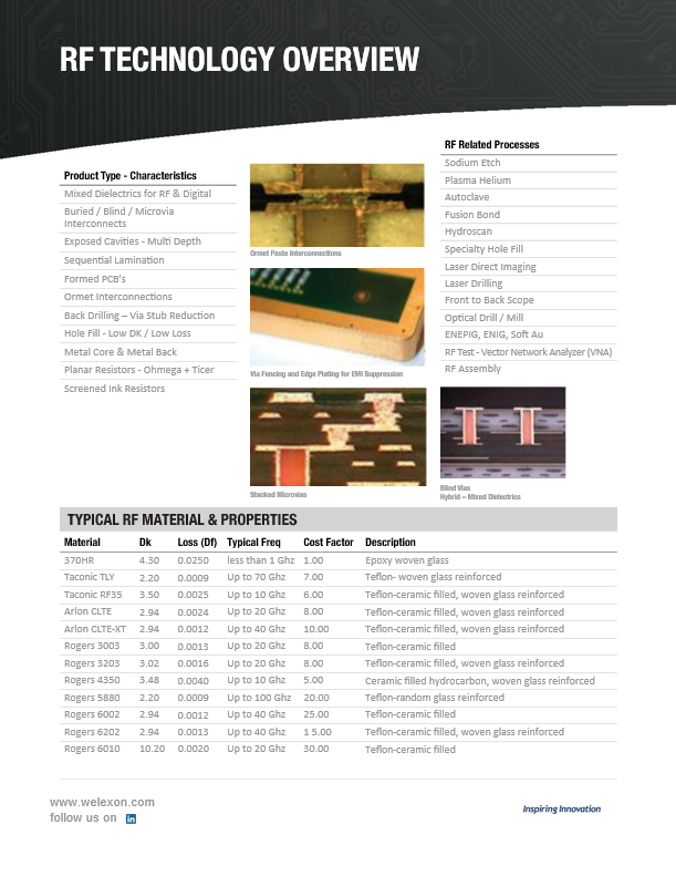 From defense, space, and aerospace electronics, to medical devices, imaging, complex telecommunications equipment, to 5G enablement, and mmWave automotive radar, WELEXON supports a wide range of frequency bands (L, S, C, X, Ku, K, Ka, V, W). We have extensive experience with a wide range of low-loss laminate materials and a total of over 70 resin systems.